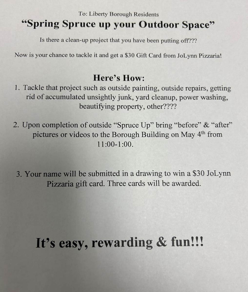 4. Bring/Send the Before and After Picture to the Borough Building by May 4, 2024 (jleber@libertyborough.com or 2921 Liberty Way)