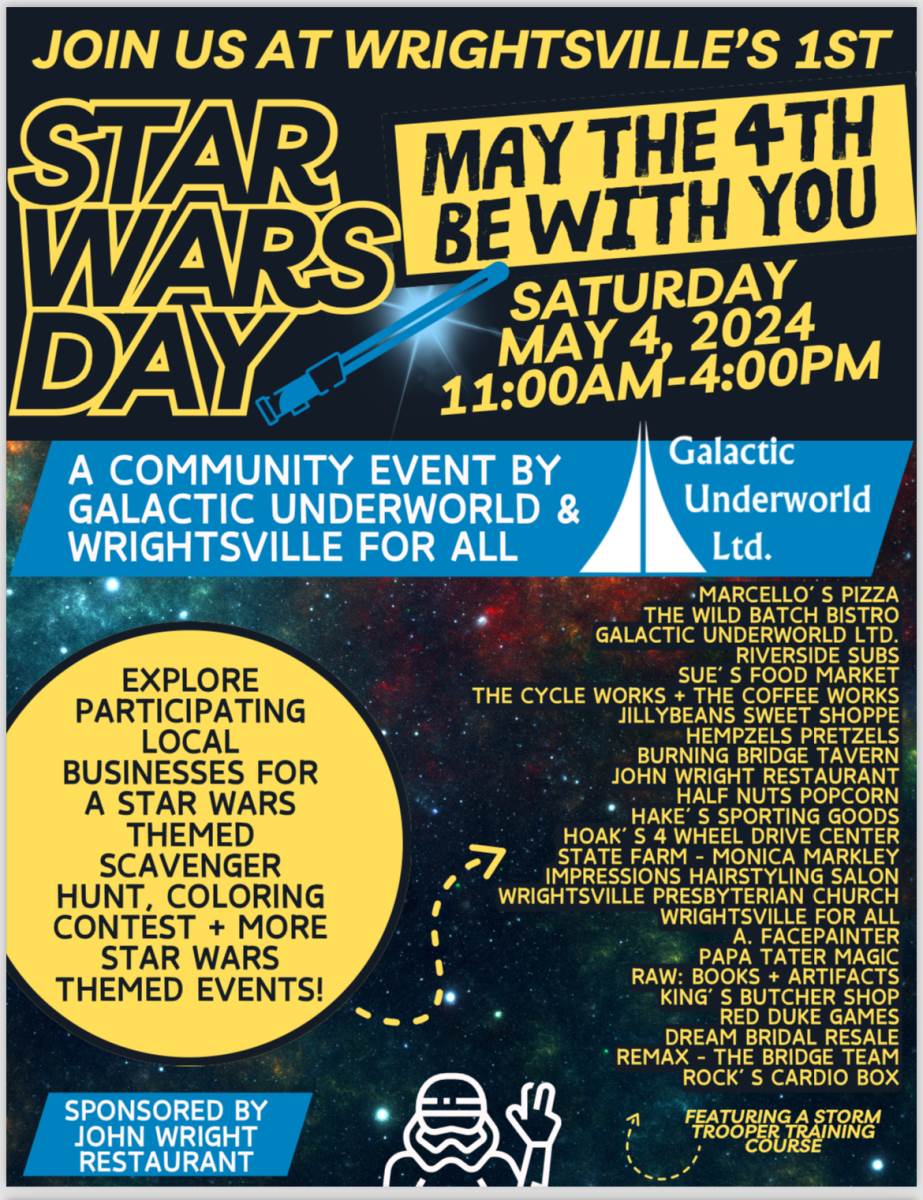 Explore participating local businesses for a Star Wars themed scavenger hunt, coloring contest and more Star Wars themed events.