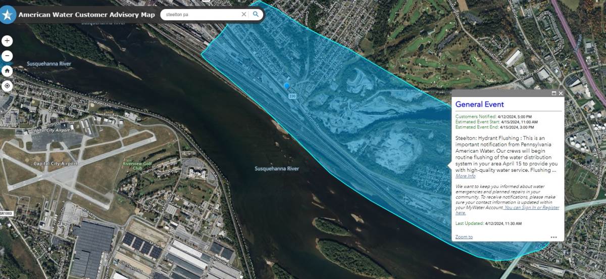 Pennsylvania American Water crews will begin routine Flushing of the water distribution system in Steelton. April 15th to provide you with high quality water service. Flushing in your area will occur between the hours of 11 a.m. and 3 p.m. Flushing also allows us to test and maintain fire hydrants. When crews are working in your area, you may notice reduced pressure or discolored water. If your water is discolored, run the cold water taps only at the lowest level of the house for about 3 to 5 minutes until the water runs clear. If discolored water occurs, please also refrain from doing laundry during the time in keeping with American waters. The focus on safety for both customers and employees. Please do not approach the crews while they work. For more information and to see a map of the affected area. Please go to PennsylvaniaAmwater.com or call 1-800-565-7292. We apologize for any inconvenience and thank you for your patience and understanding while PAAW undertakes this necessary maintenance of the water system.