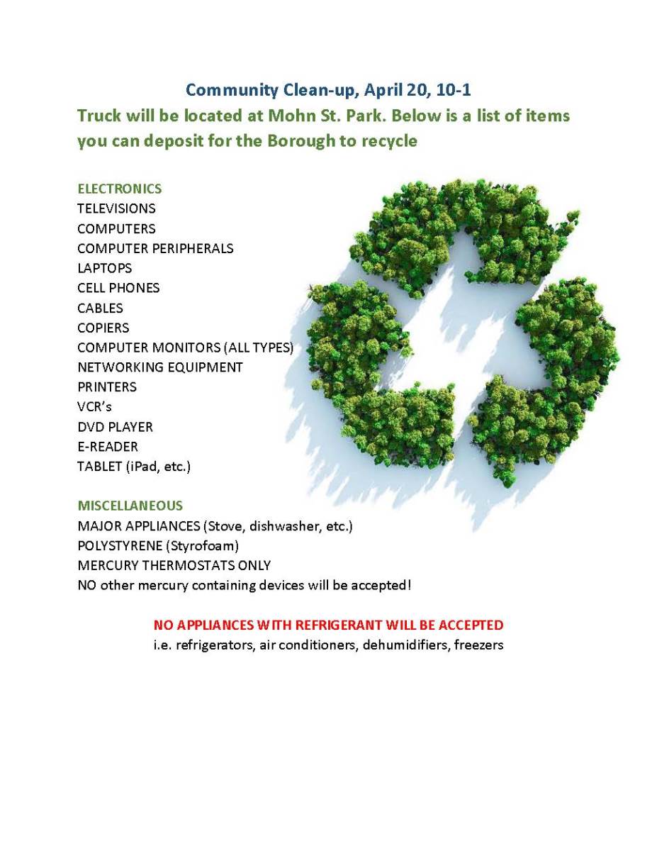 In conjunction with the clean Streets! Happy Feet! event scheduled for 4/20/2024, 10-1, the Borough will be holding a recycling event as well.