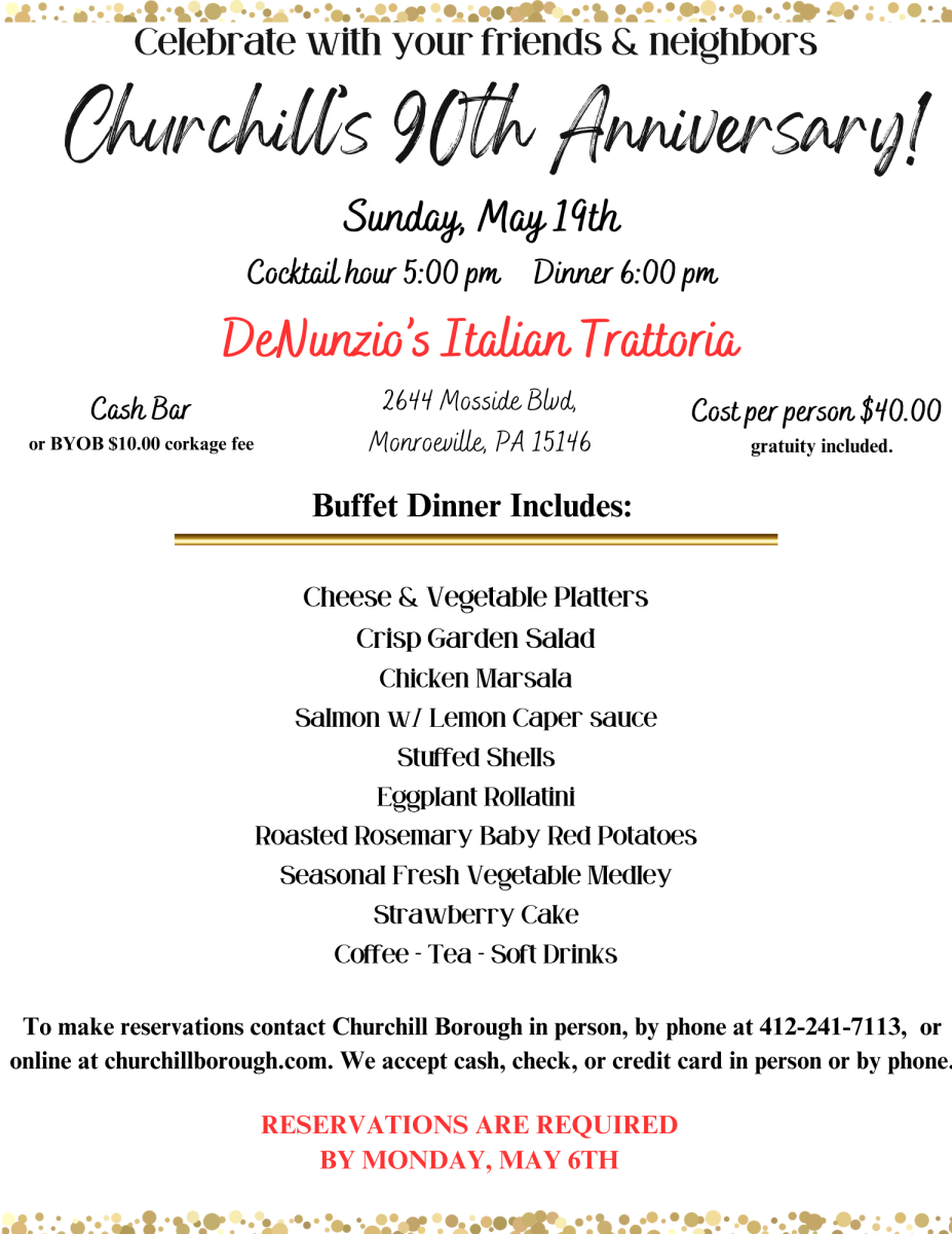 Come celebrate Churchill's 90th anniversary with your friends and neighbors at our annual dinner on Sunday, May 19th, 2024 at DeNunzio's Italian Trattoria. For more information and to book a reservation go to https://www.churchillborough.com/community/news-events/churchill-annual-dinner or call the borough at 412-241-7113. Reservations are required by May 6th!
