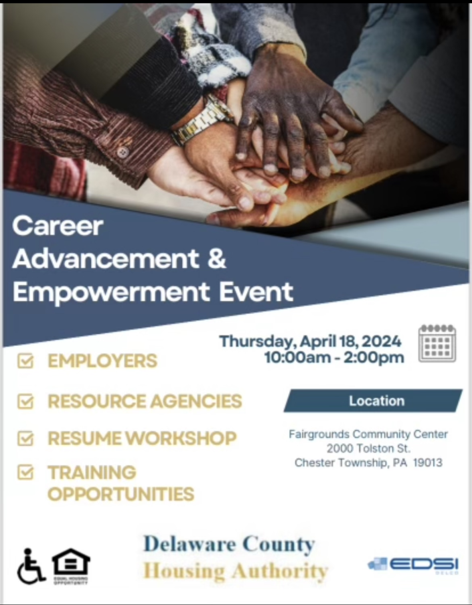 Come attend this event tomorrow at the Fairgrounds Community Center, 2000 Tolston Street Chester Township PA 19013, from 10am to 2pm. This event will feature different training opportunities, resume workshops, resource agencies, and more.