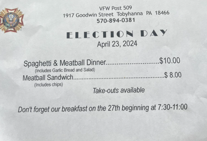 VFW Post 509 will be open from 11am-6:30pm on Election Day, Tuesday, April 23, 2024 and will feature a Spaghetti and Meatball Dinner including Garlic Bread and Salad, for a donation in the amount of $10.00 as well as a Meatball Sandwich with Chips for $8.00. VFW Post 509 is located at 1917 Goodwin Street, Tobyhanna, PA 18466. Any questions, please call the Post directly at 570.894.0381