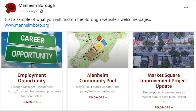 Looking for information about the pool, Market Square, the Borough Manager position, construction projects? Visit WWW.MANHEIMBORO.ORG