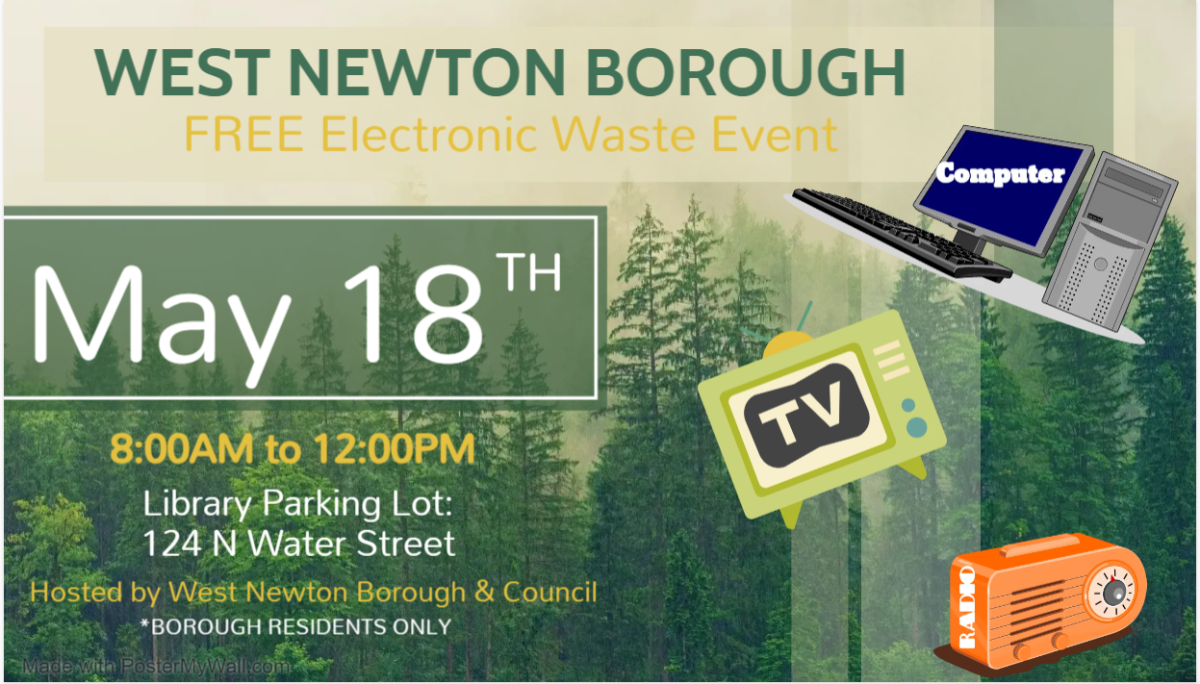 As a reminder, tomorrow (May 18th) is West Newton Borough's FREE E-waste recycling event hosted by West Newton Borough and Borough Council. This event will take place at the Library parking lot from 8AM - 12PM.