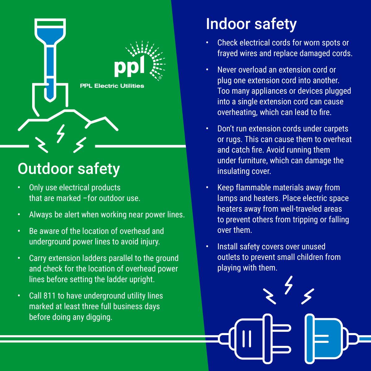 PPL Electric employees make safety their priority during every job, and we want to make sure our customers always stay safe around electricity and stay aware of potential electrical safety hazards. This infographic shares some tips for how to stay safe around electricity when working on indoor or outdoor projects.
