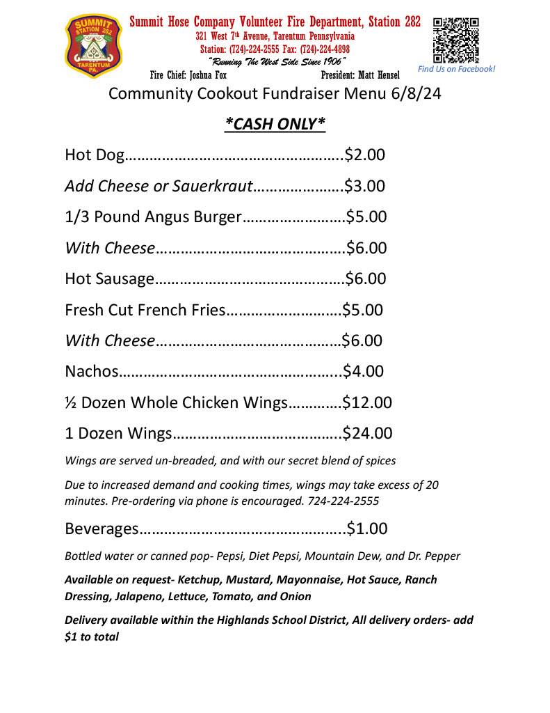 For more information, please contact the Summit Hose Fire Company at 724-224-2555. Thank you for your support!