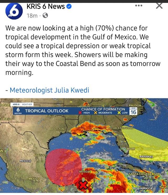 We are now looking at a high (70%) chance for tropical development in the Gulf of Mexico. We could see a tropical depression or weak tropical storm form this week.