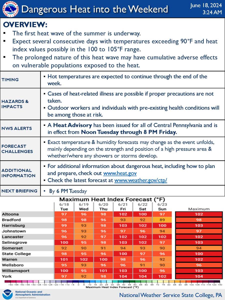 Dangerous Heat is expected through the rest of the week and into the weekend. Daily temperatures will be near or above 90°F, and heat index readings will be near or even top 100°F each afternoon.