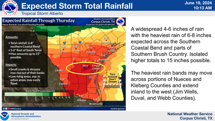 · Heaviest rain bands may move across portions of Nueces & Kleberg Counties and extend inland to the west.