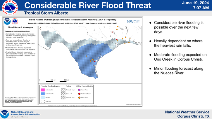 Tropical Storm Alberto became organized enough this morning to be classified as a Tropical Storm. This system will continue to move to the west through the day slowly. Landfall is expected along the northeast coast of Mexico tonight. Regardless of development and the landfall location, several hazards will be felt over South Texas through Thursday due to the large extent and slow movement of this system. The main threats continue to be a moderate to high risk of flash flooding, significant coastal flooding, a high risk of rip currents, river flooding, and wind gusts over 50 mph along the coast. Continue to check the National Weather Service website (https://www.weather.gov/crp/) frequently for updates.