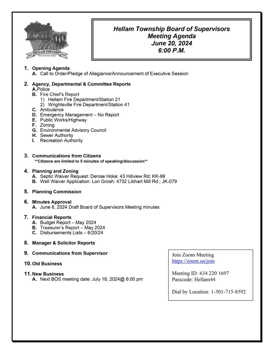 Board of Supervisors Meeting TONIGHT 6/20/24 @ 6PM