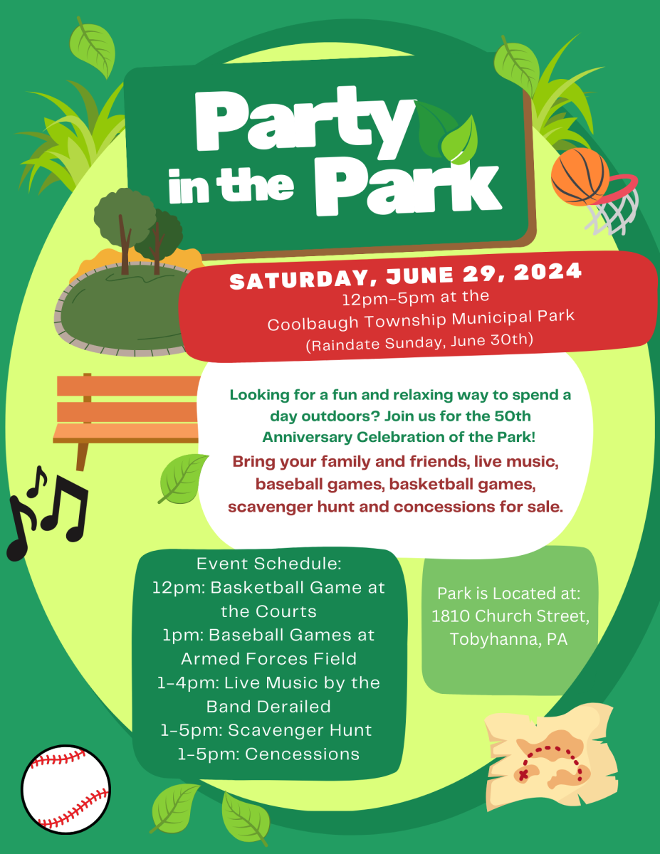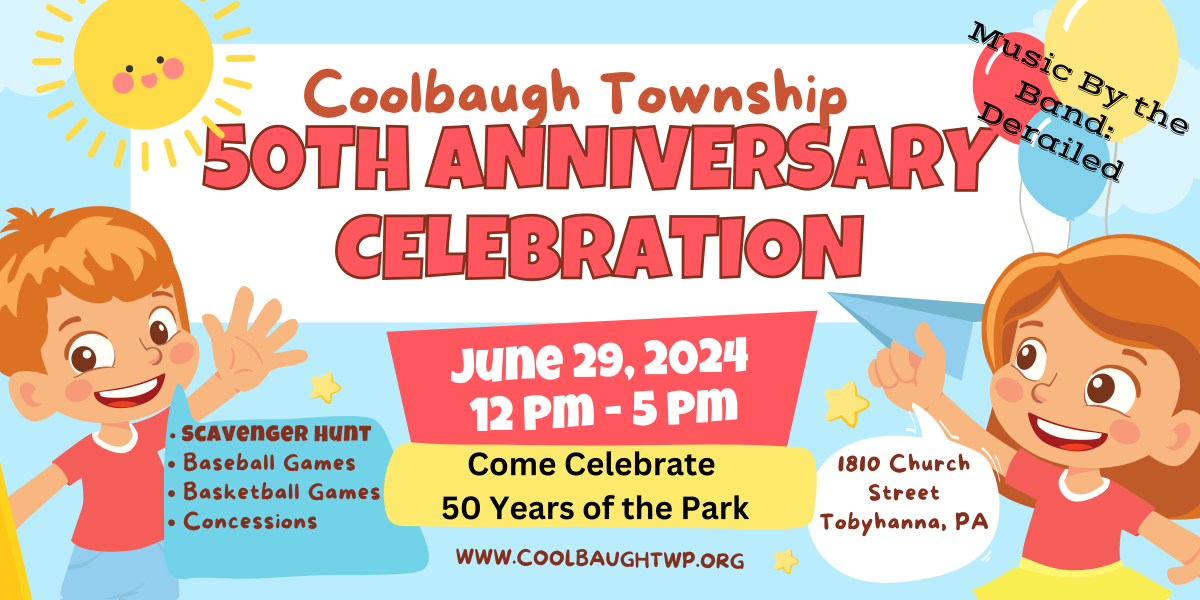 We are still on for today and on schedule, so grab your family and friends and head up to the park. The Coolbaugh Township Municipal Park turns 50 years old and the Parks and Recreation Commission will be celebrating today, Saturday, June 29, 2024 from 12-5pm. Festivities will begin with an anniversary commemoration at the Armed Forces Field at 12pm followed by a park-wide scavenger hunt, baseball games, basketball games/ competitions, and concessions provided by different community organizations!! There will be music featuring the band Derailed from 1pm-4pm. The first 150 people to visit the Parks and Recreation table will receive a $5.00 food voucher for one of the concessions that will be located throughout the park. It is sure to be a day filled with fun for all ages!!! Ceremony will begin promptly at 12pm.