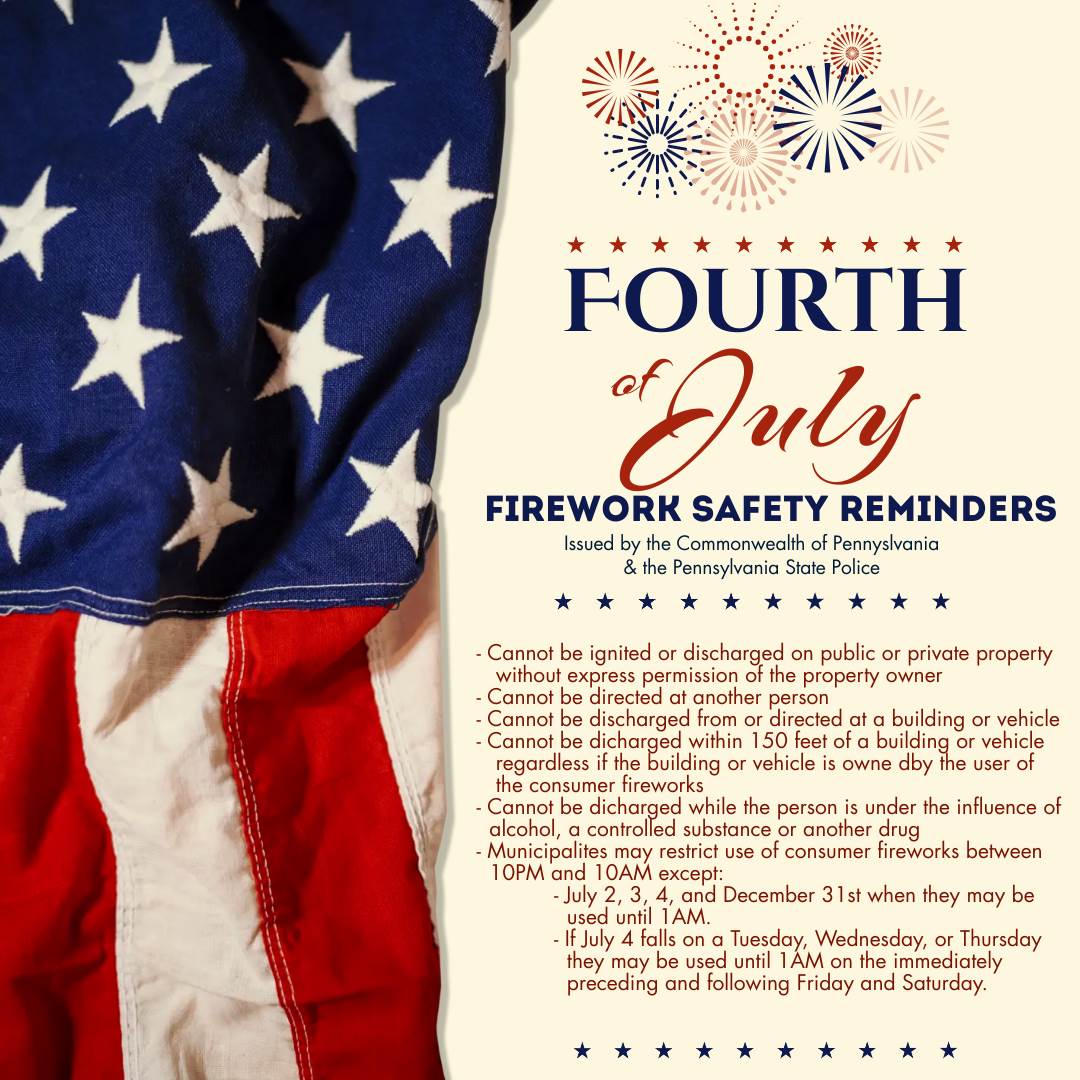Please see the attached document for Firework Safety reminders provided by the Commonwealth of Pennsylvania & Pennsylvania State Police.