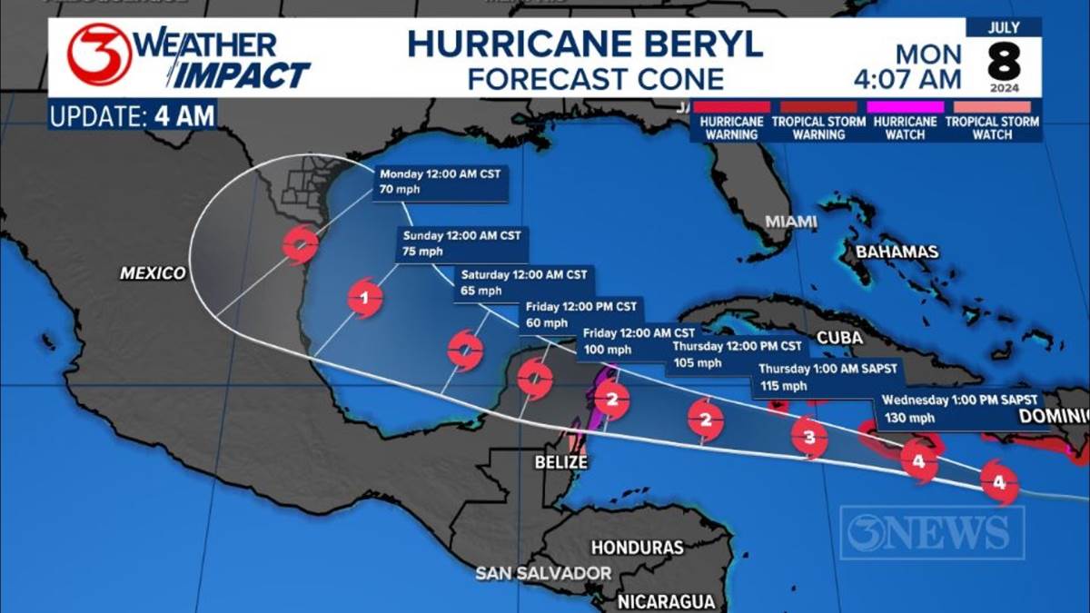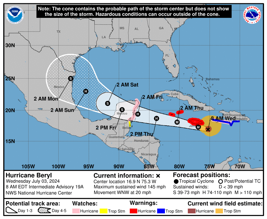 The National Weather Service has reported that Hurricane Beryl, a Category 5 hurricane, is currently moving across the Caribbean as a powerful storm. As it enters the Gulf of Mexico, it is expected to downgrade to a tropical storm due to interaction with cooler waters and wind shear. However, there is a possibility of it strengthening back into a hurricane before making landfall, potentially impacting areas in either Mexico or the southern United States.