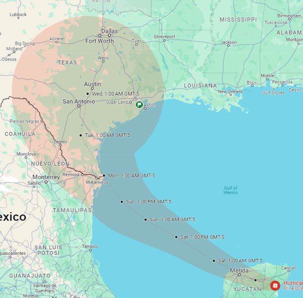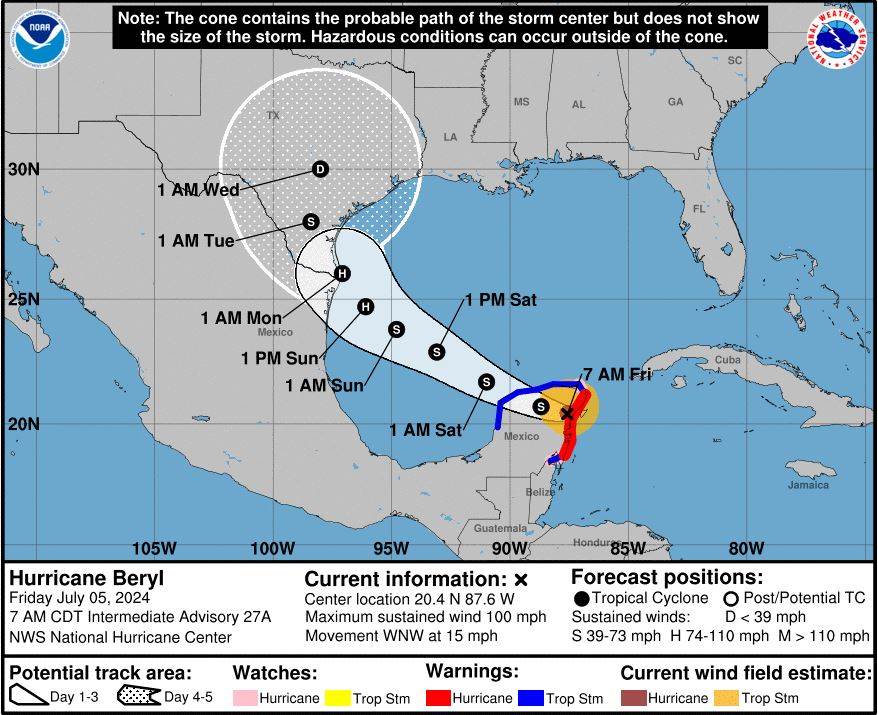 Path Prediction: After crossing the Yucatán Peninsula, Beryl is expected to enter the Gulf of Mexico. The storm is projected to turn northward, influenced by a subtropical ridge and an upper-level low in the Gulf. This shift may bring Beryl closer to the Texas coastline.