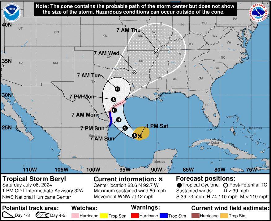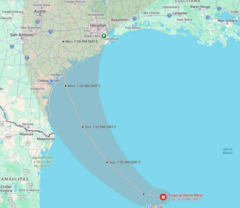 Current Status: Beryl is currently a strong tropical storm with wind speeds around 60 mph and is expected to strengthen to hurricane status before landfall.