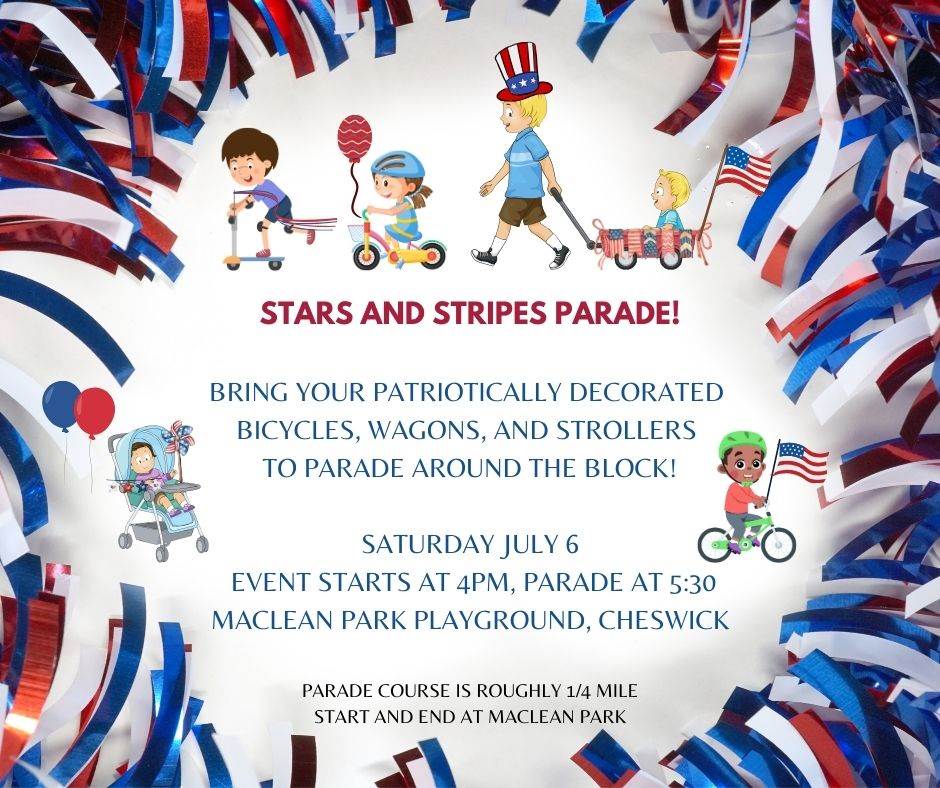 We can't wait to see your patriotically decorated bikes, scooters, wagons, and strollers!! WOOHOO!!
