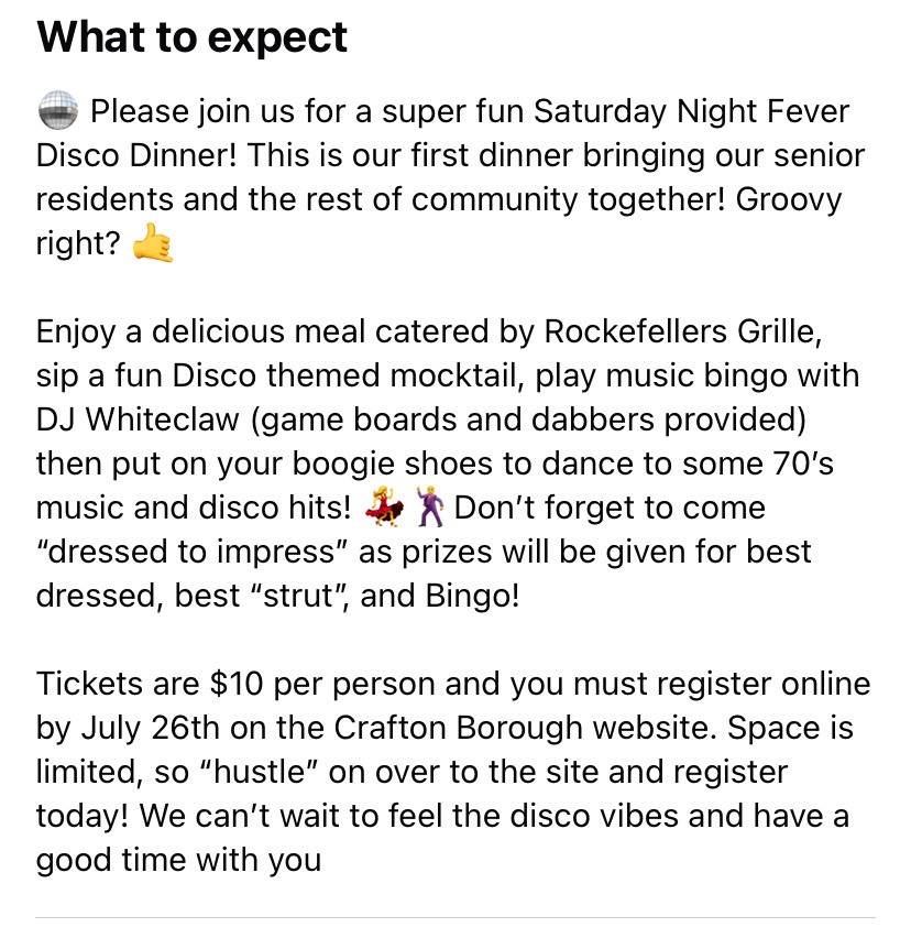 Tickets are $10 per person and you must register online by July 26th on the Crafton Borough website. Space is limited, so “hustle” on over to the site and register today! We can’t wait to feel the disco vibes and have a good time with you!