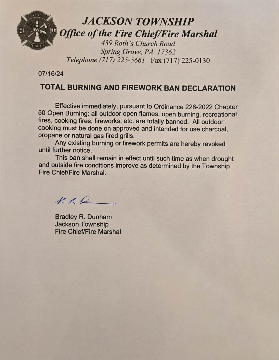 Please see the attached Burn Ban Notice per Jackson Township Ordinance 226-2022.
