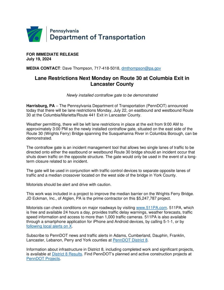 Weather permitting, there will be left lane restrictions in place at the exit from 9:00 AM to approximately 3:00 PM so the newly installed contraflow gate, situated on the east side of the Route 30 (Wrights Ferry) Bridge spanning the Susquehanna River in Columbia Borough, can be demonstrated.