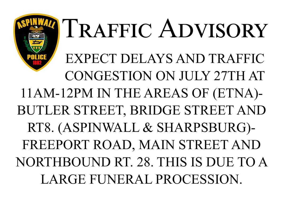 EXPECT DELAYS AND TRAFFIC CONGESTION ON JULY 27TH AT 11AM-12PM IN THE AREAS OF (ETNA)-BUTLER STREET, BRIDGE STREET AND RT8. (ASPINWALL & SHARPSBURG)-FREEPORT ROAD, MAIN STREET AND NORTHBOUND RT. 28. THIS IS DUE TO A LARGE FUNERAL PROCESSION.