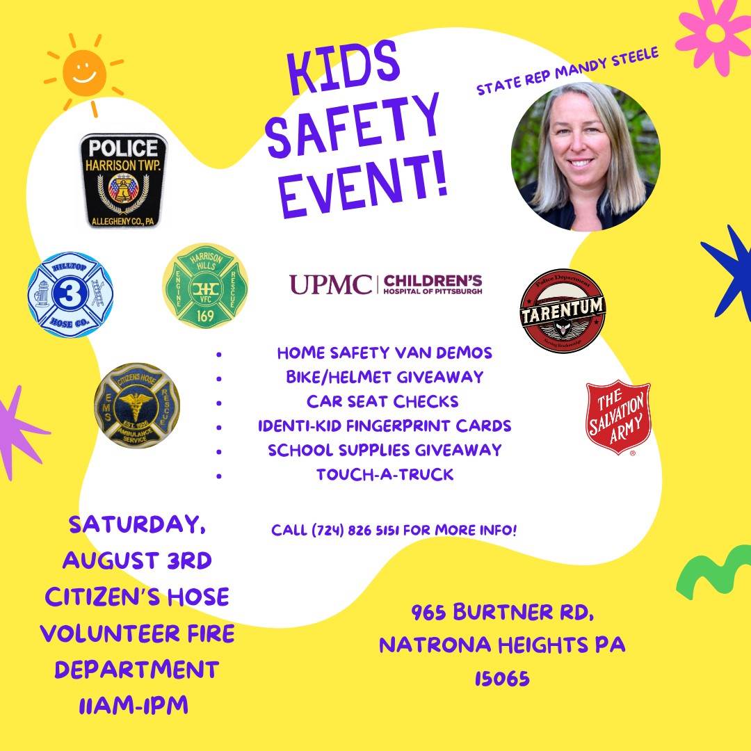 We already know that the Salvation Army, Hilltop Hose Fire Company, Harrison Hills Fire Company, Citizens Hose Fire Company, Citizens Hose Ambulance Service, Harrison Township Police Department, and Tarentum Borough Police Department will be on-scene serving up some Summertime Safety! See you there!