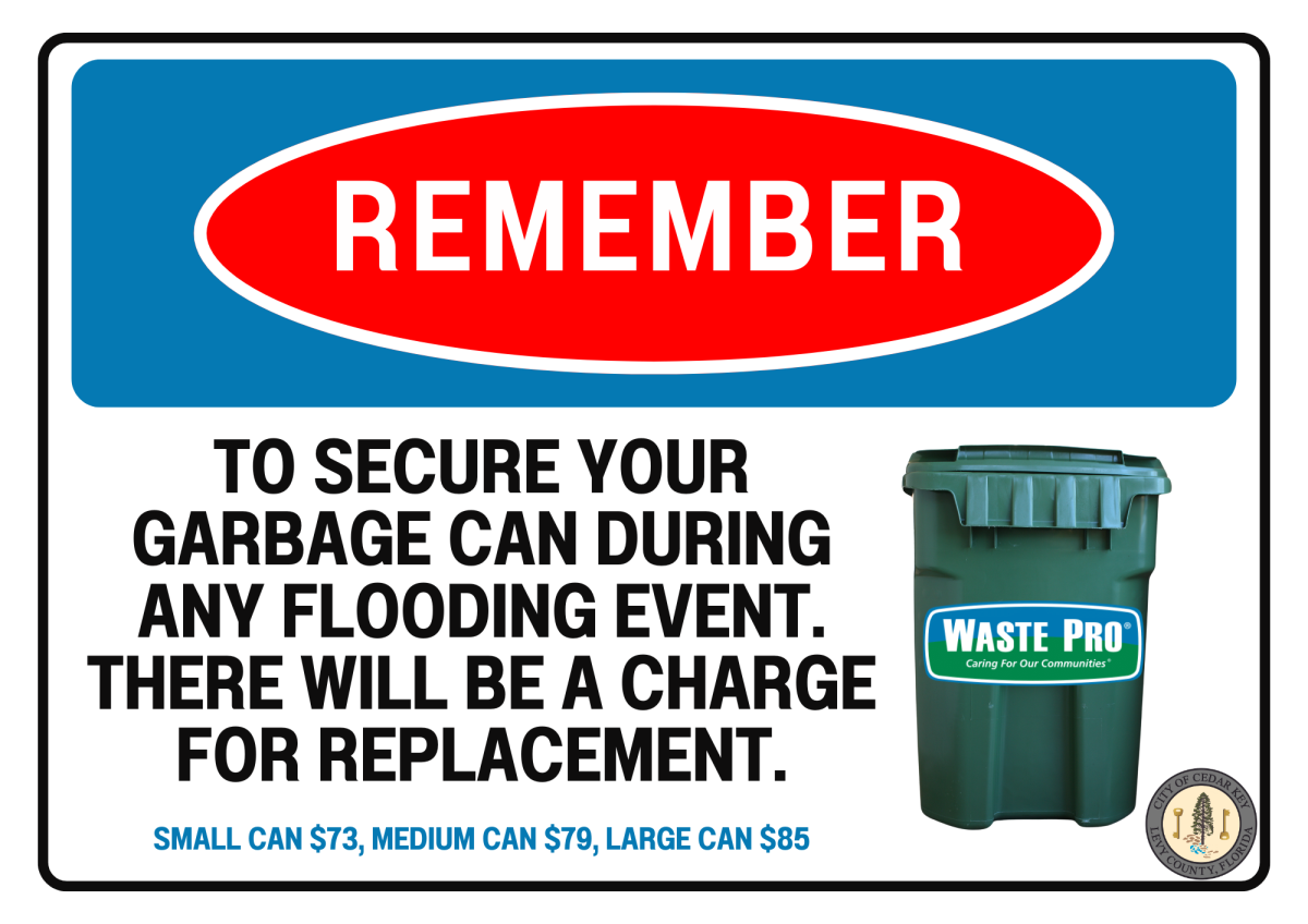 Remember to secure your garbage cans so they don't float away!!! There will be a charge for Replacement Cans: