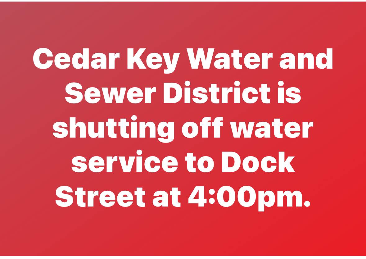 Cedar Key Water and Sewer District is shutting off water service to Dock Street at 4:00pm.
