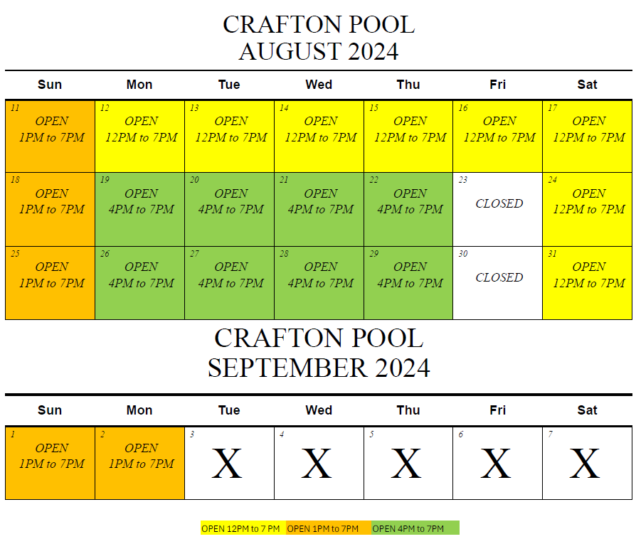 The Crafton Pool will remain open through Labor Day during the following dates and times.