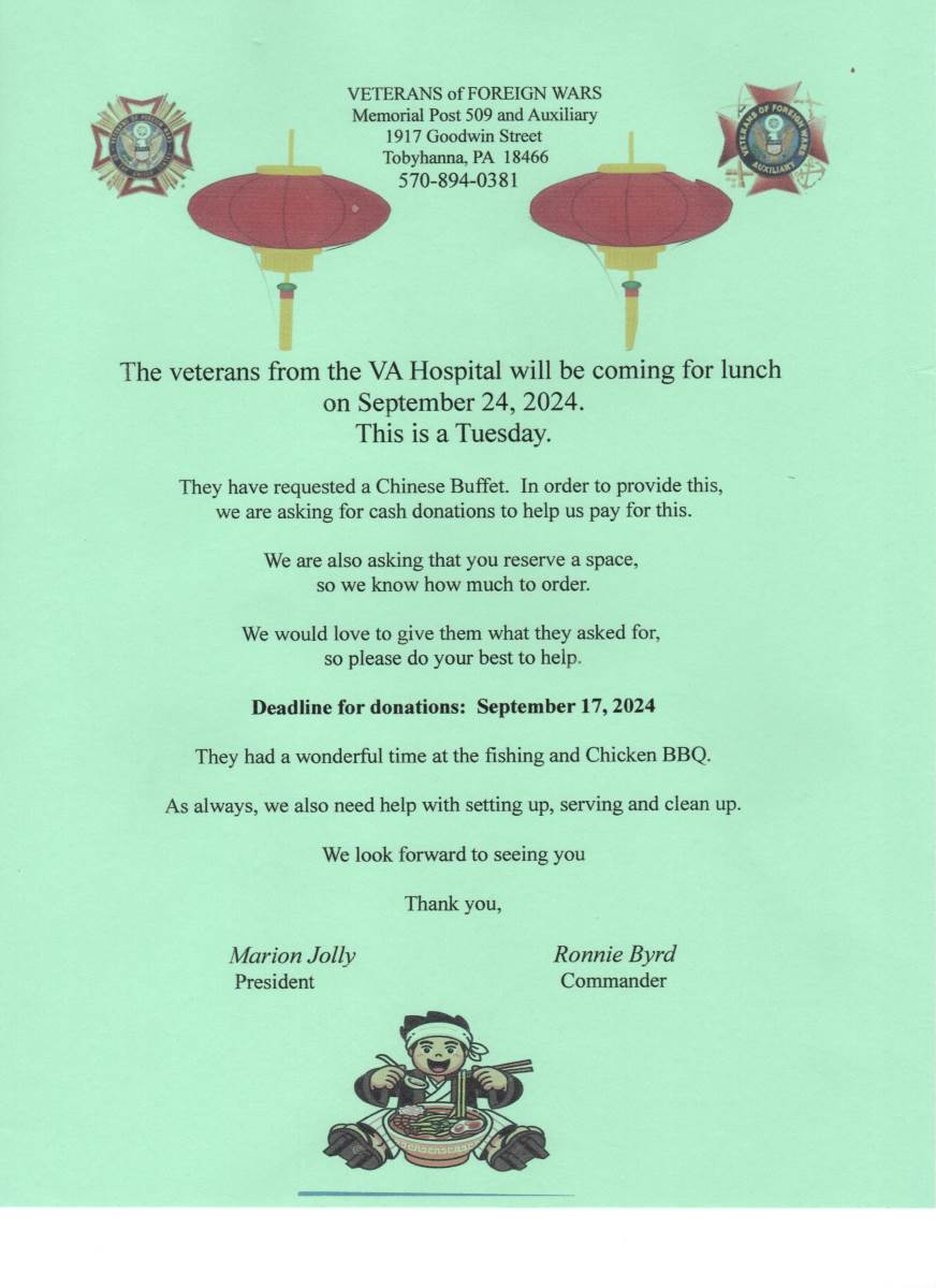 VFW Post 509 will be hosting veterans from the VA Hospital for a lunch on Tuesday, September 24, 2024. The veterans have requested a Chinese buffet, therefore the VFW is asking for donations to help pay for the expense of providing this meal. The deadline for donations is September 17th. For more information or to make a donation, please see the attached flyer.