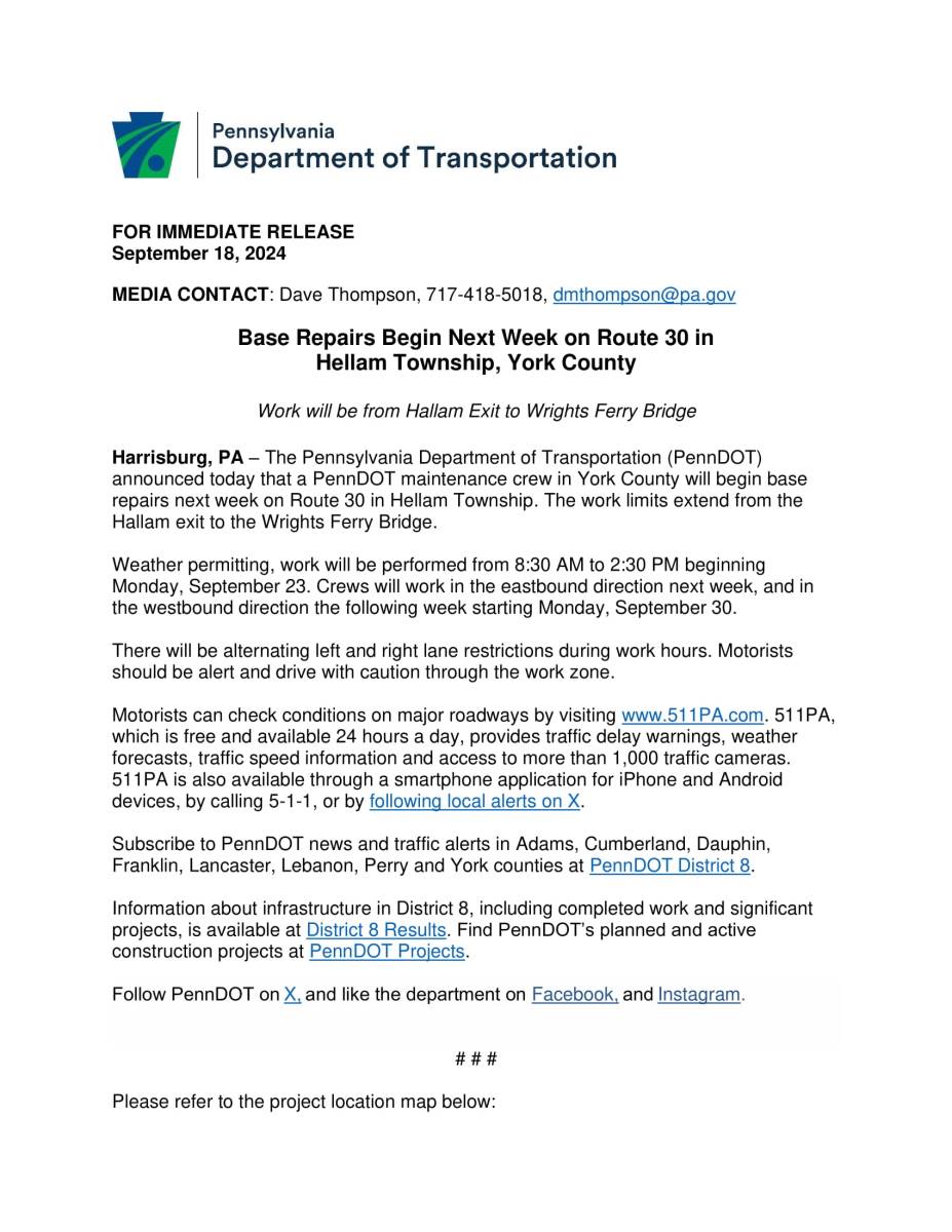 PennDOT will begin base repairs on Route 30 beginning Monday, September 23rd. Weather permitting, work will be performed from 8:30 AM to 2:30 PM . The work limits extend from the Hallam exit to the Wrights Ferry Bridge. Crews will work in the eastbound direction next week, and in the westbound direction the following week starting Monday, September 30. There will be alternating left and right lane restrictions during work hours. Motorists should be alert and drive with caution through the work zone.