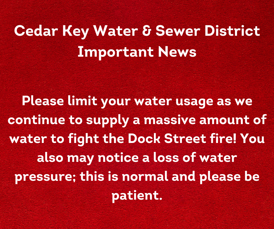 Please limit your water usage as the Cedar Key Water & Sewer District continues to supply a massive amount of water to fight the Dock Street fire. You also may notice a loss of water pressure; this is normal and please be patient.