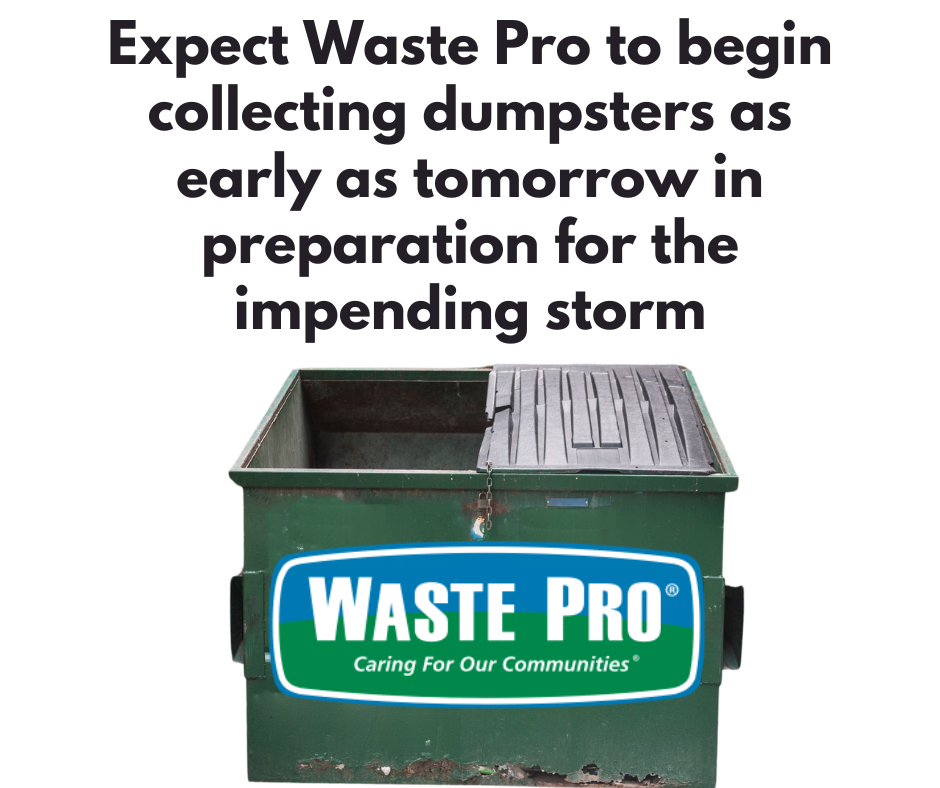 Expect Waste Pro to begin collecting dumpsters as early as tomorrow in preparation for the impending storm.