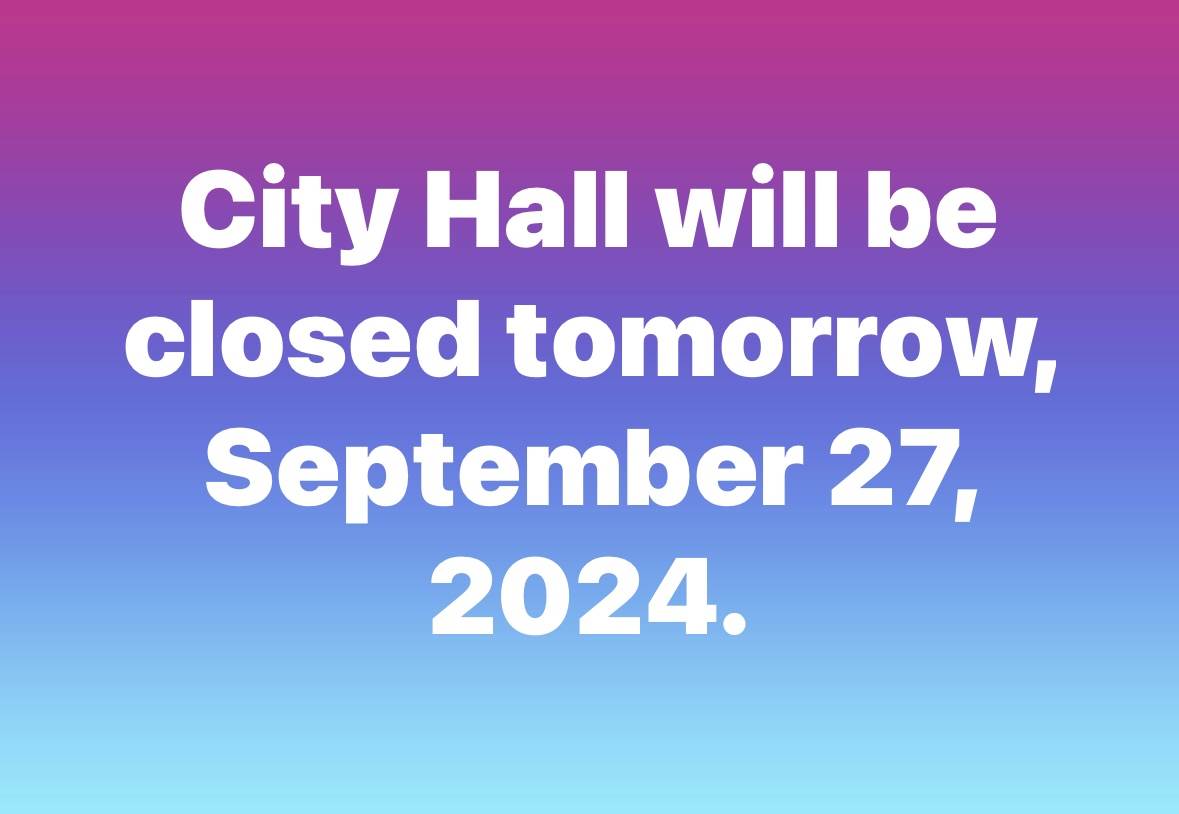 City Hall will be Closed Tomorrow - Friday, September 27, 2024.