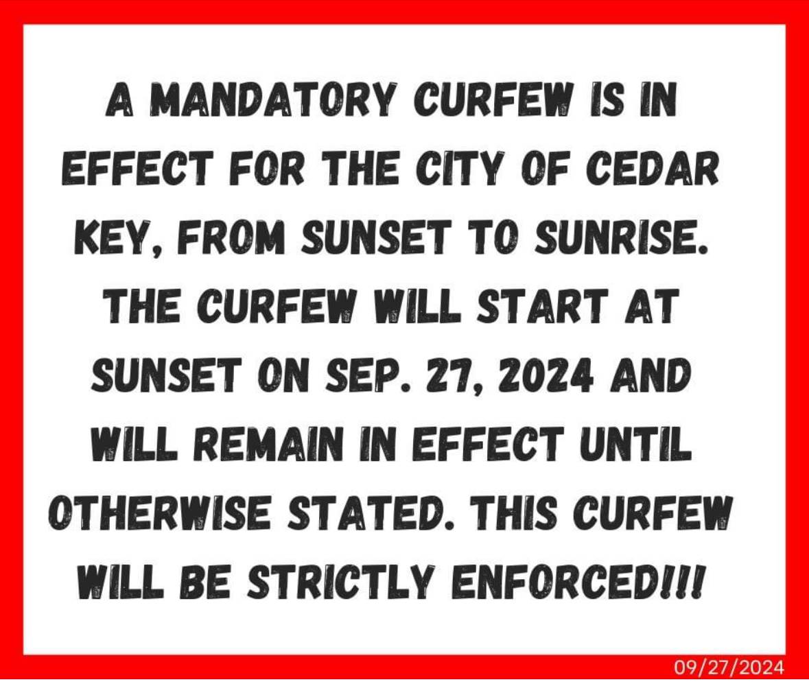 A Mandatory Curfew is in effect from sunset to sunrise until further notice.