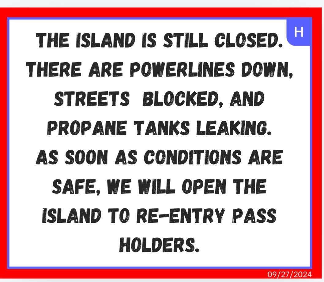 The Island is still closed. There are powerlines down, streets blocked, and propane tanks leaking.