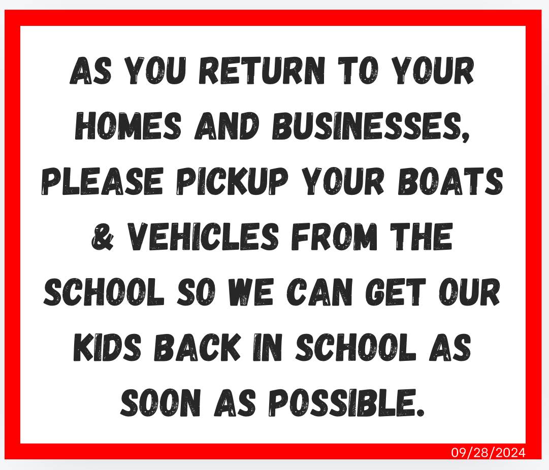 As you return to your homes and businesses, please pickup your boats & vehicles from the school so we can get our kids back in school as soon as possible.