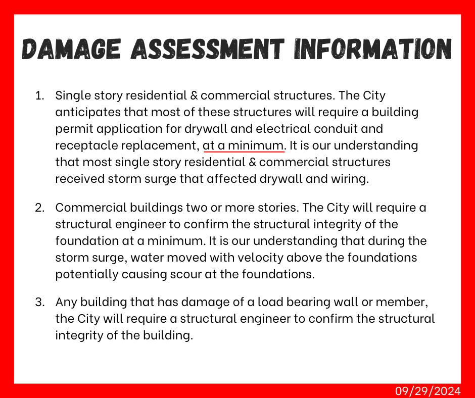 Commercial buildings two or more stories. The City will require a structural engineer to confirm the structural integrity of the foundation at a minimum. It is our understanding that during the storm surge, water moved with velocity above the foundations potentially causing scour at the foundations.