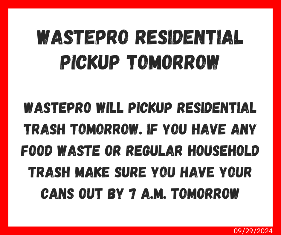 WastePro will Pickup residential trash tomorrow. If you have any food waste or regular household trash make sure you have your cans out by 7 a.m. tomorrow