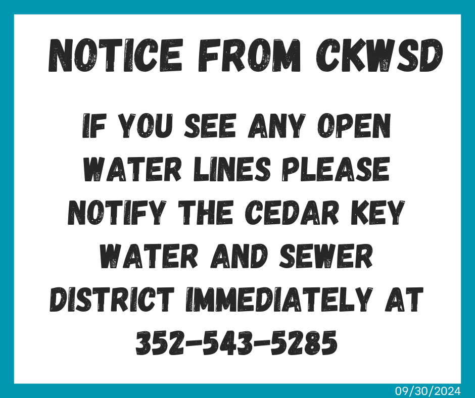 IF YOU SEE ANY OPEN WATER LINES PLEASE NOTIFY THE CEDAR KEY WATER AND SEWER DISTRICT IMMEDIATELY AT