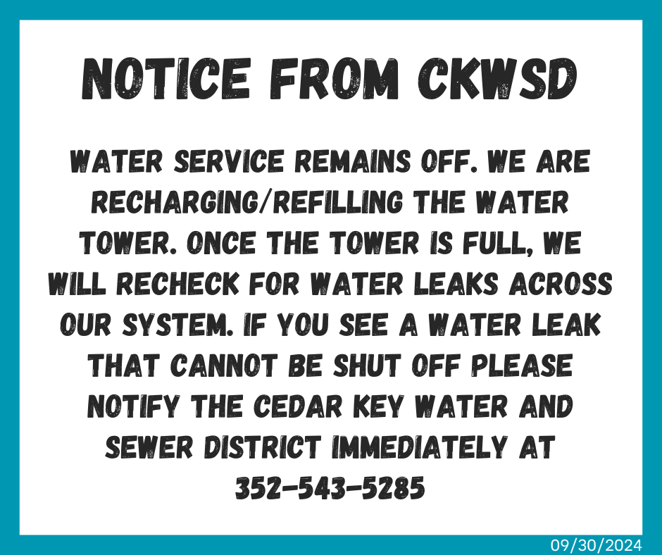 Water Service remains off. We are recharging/refilling the water tower. Once the tower is full, we will recheck for water leaks across our system. If you see a water leak that cannot be shut off PLEASE NOTIFY THE CEDAR KEY WATER AND SEWER DISTRICT IMMEDIATELY AT