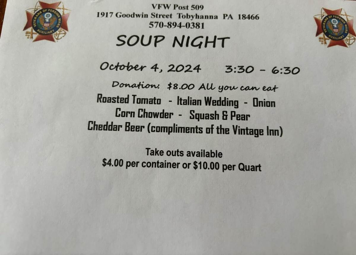 VFW Post 509 will be hosting a soup night tonight, Friday, October 4, 2024 from 3:30pm-6:30pm at the Post located at 1917 Goodwin Street, Tobyhanna, PA 18466. A donation of $8.00 will get you an all you can eat meal with the following soup options available: Roasted Tomato, Italian Wedding, Onion, Corn Chowder, Squash and Pear, and Cheddar Beer Soup (compliments of the Vintage Inn). Take out is available as well for a donation of $4.00 per container or $10.00 per quart. Any questions, please contact the post directly at 570.894.0381.