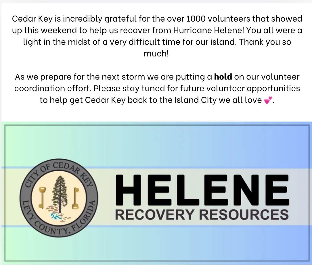 Cedar Key is incredibly grateful for the over 1000 volunteers that showed up this weekend to help us recover from Hurricane Helene! You all were a light in the midst of a very difficult time for our island. Thank you so much!