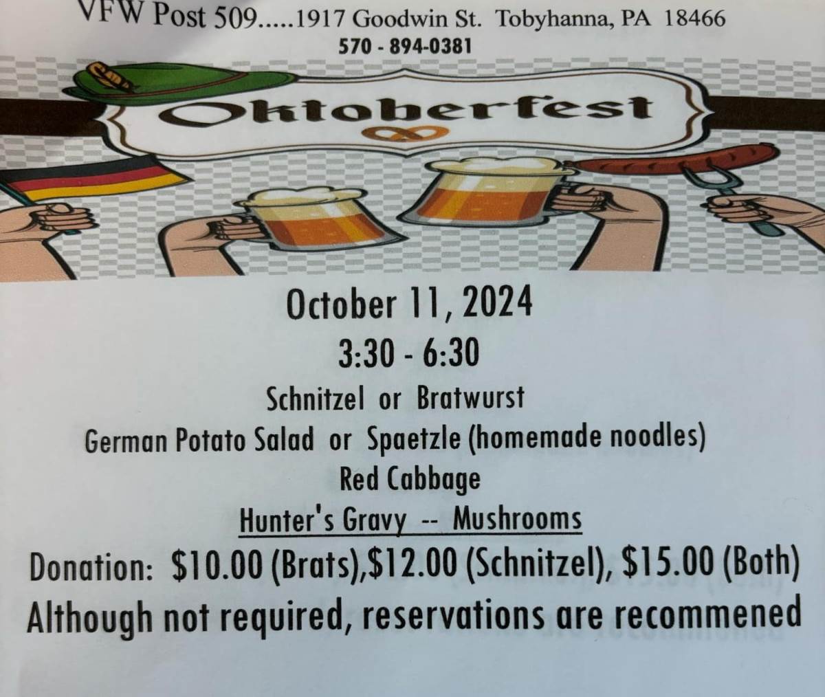 VFW Post 509 will be hosting Oktoberfest this Friday, October 11, 2024 from 3:30pm-6:30pm at the Post located at 1917 Goodwin Street, Tobyhanna, PA 18466. Meals include your choice or Schnitzel or Bratwurst, German Potato Salad or Spaetzle (Homemade Noodles), Red Cabbage and Hunters Gravy- Mushrooms. A donation of $10.00 (Bratz), $12.00 (Schnitzel, or $15.00 (Both). Although they are not required, Reservations are recommended. Any questions, please contact the post directly at 570.894.0381.