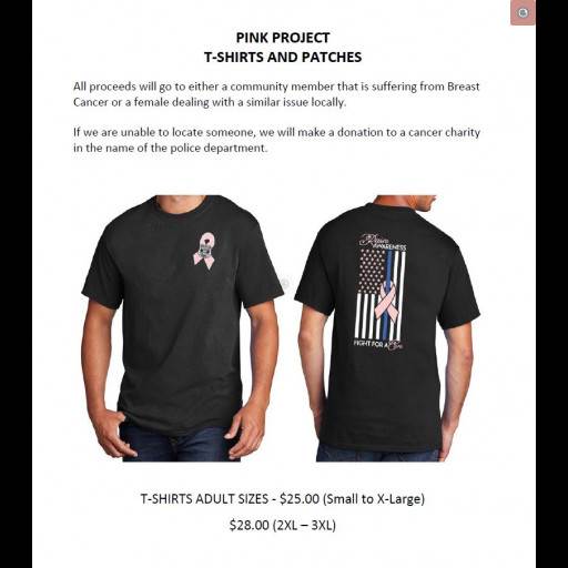 We have pink Caernarvon Township Police Patches for sale for $10 ea. and shirt left over from previous years fundraiser for sale at $25 ea. (sizes XXL and XXXL) are $28 ea.