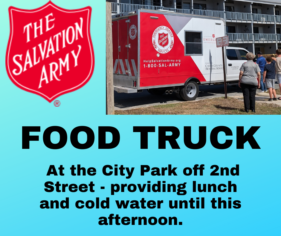 The Salvation Army has a Food Truck at the City Park providing lunch and cold water until this afternoon.