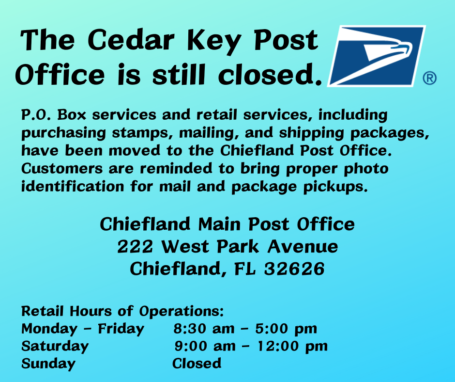 P.O. Box services and retail services, including purchasing stamps, mailing, and shipping packages, have been moved to the Chiefland Post Office. Customers are reminded to bring proper photo identification for mail and package pickups.
