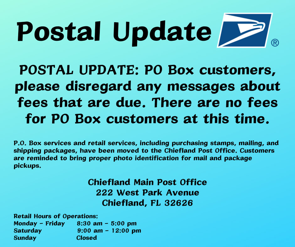POSTAL UPDATE: PO Box customers, please disregard any messages about fees that are due. There are no fees for PO Box customers at this time.