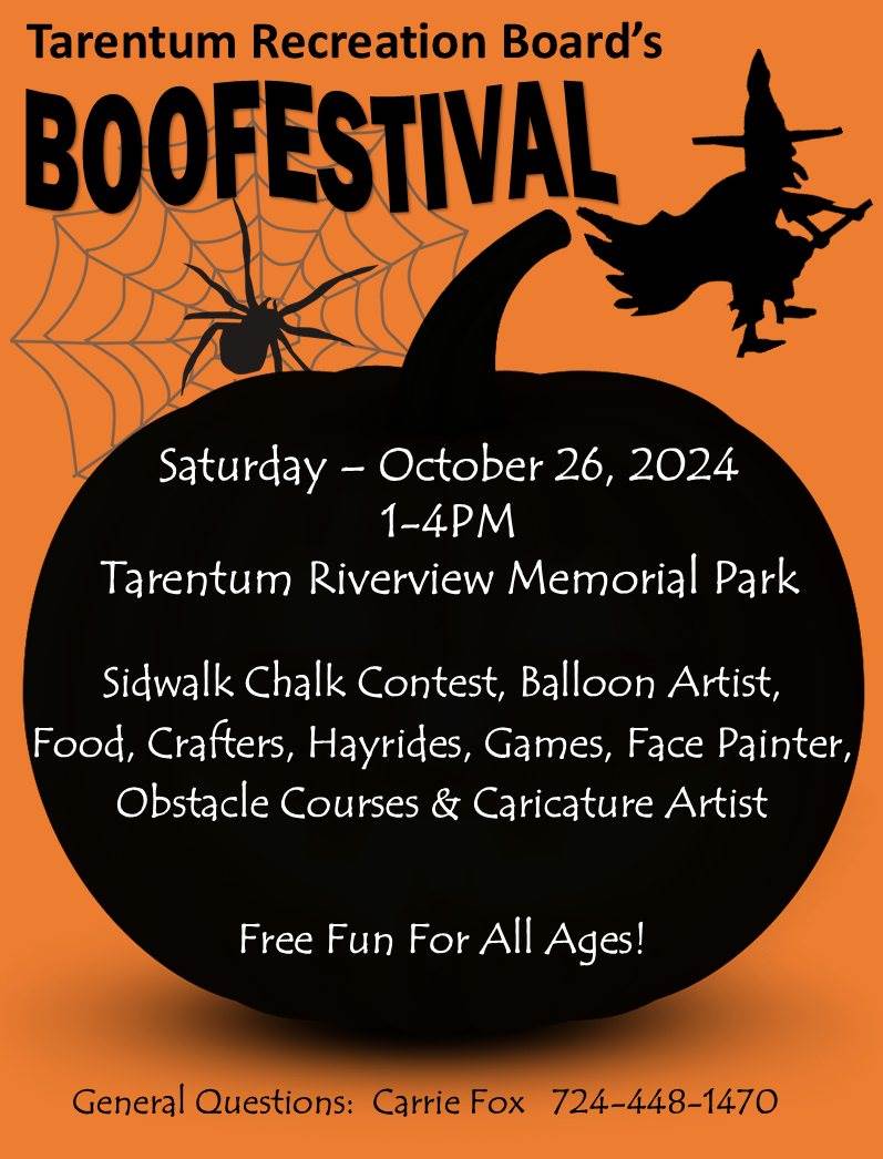 Join us on Saturday, October 26, 2024, from 1:00 PM to 4:00 PM at Tarentum Riverview Memorial Park for a spooktacular time at the BooFestival! This event is free and fun for all ages, so bring the whole family for an afternoon of Halloween-themed activities.